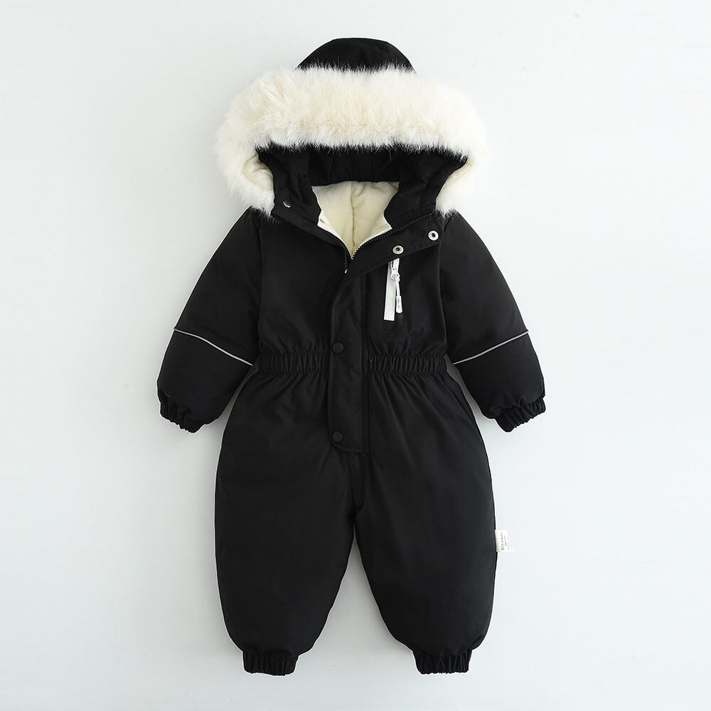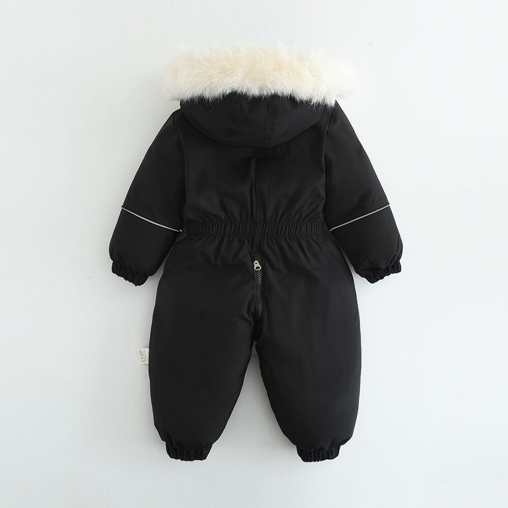 ボリュームたっぷりの大判ファー襟が目を引く、冬の最新スノーウェアです。裏起毛仕様の厚手生地を採用し、真冬の寒さや雪遊びでもお子様を暖かく守ります。ベビーから幼児まで対応するワンピース(ロンパース)型で、隙間風を通さず、着脱もスムーズな設計です。