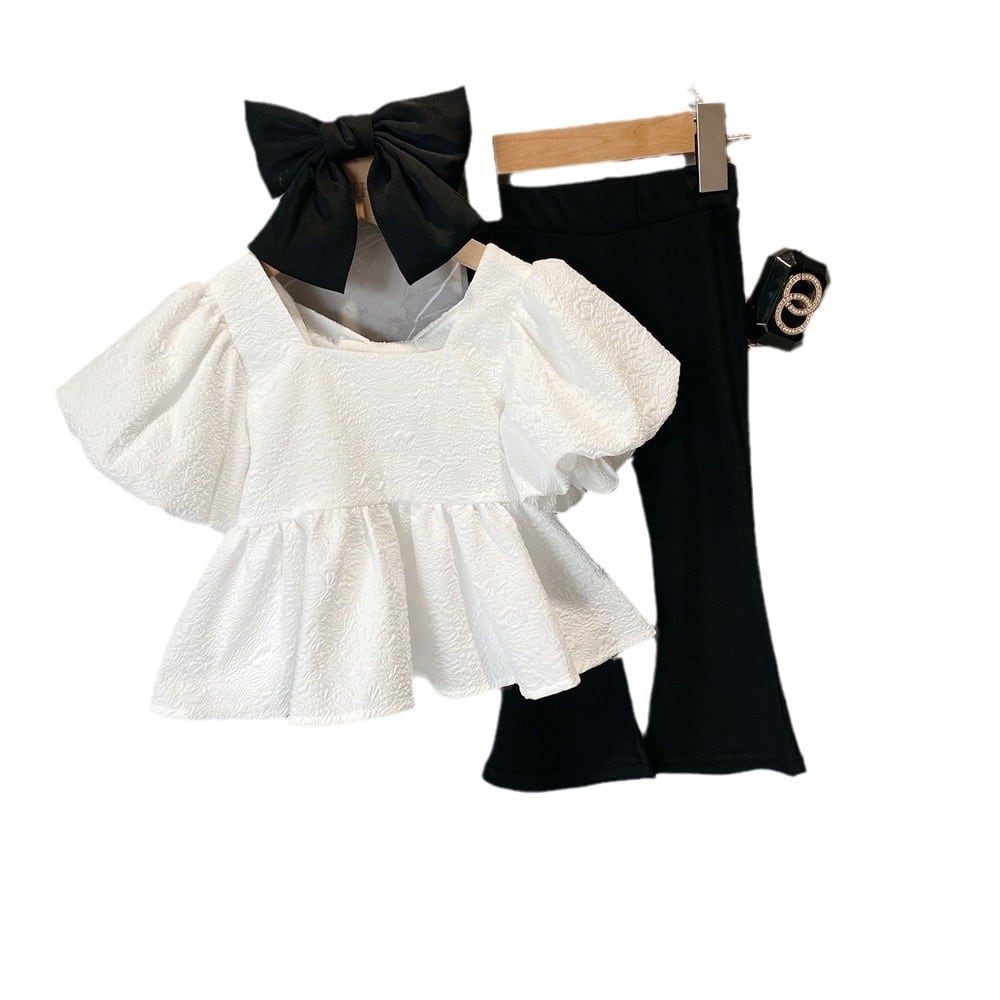 立体感のあるジャガード風の生地を使用したトップスは、ふんわりとしたパフスリーブとペプラムシルエットがまるでお姫様のような華やかさを演出。セットのブラックパンツは裾が広がるフレアデザインで、スタイルアップも叶えてくれます。発表会やお誕生日会、特別な日のお出かけにぴったりな、主役級の一着です。