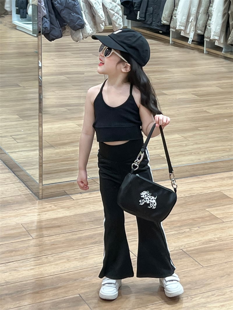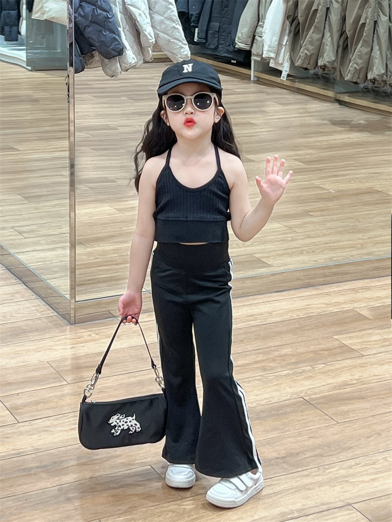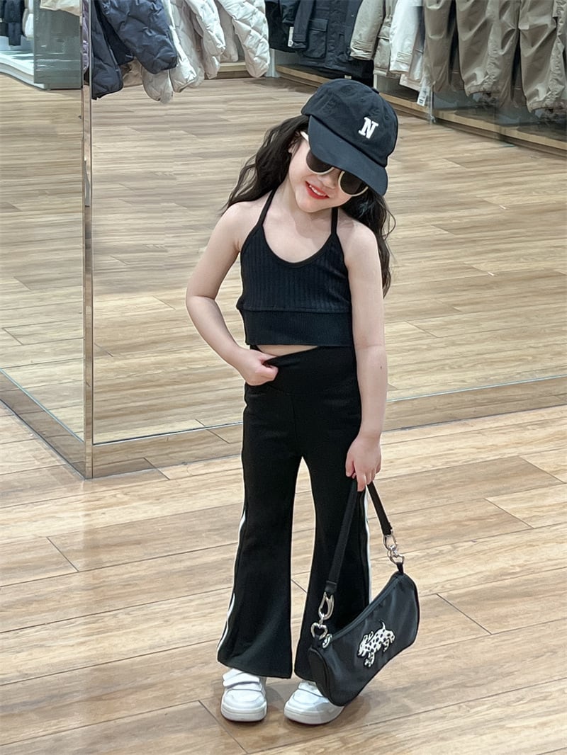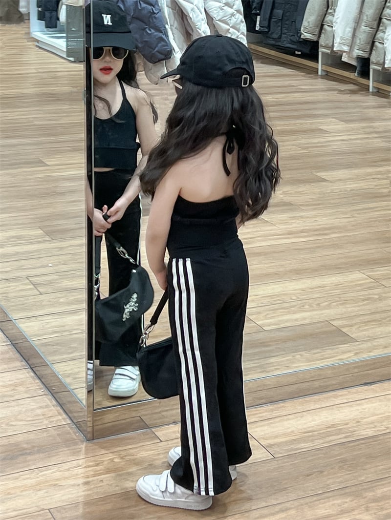 首元をすっきりと見せるホルターネックタンクトップに、シルエットの美しさが際立つフレアパンツを合わせたスタイリッシュな一着。パンツはハイウエスト仕様で、ウエストゴム入りなので動きやすさも抜群です。サスペンダーがアクセントになり、お子様の可愛らしさの中に「大人っぽさ」をプラスしてくれます。ダンスやヨガ、お出かけシーンでも目を惹くこと間違いなしのアイテムです。